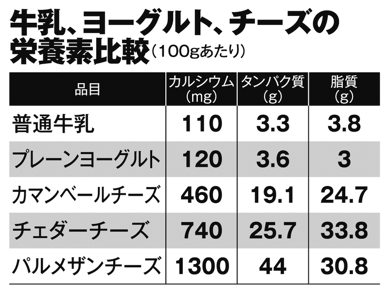 「発酵した乳製品なら乳糖を分解する必要がなく、消化・吸収がいい。ヨーグルトもいいですが、それをさらに固めたのがチーズです。チーズはタンパク質が豊富でカルシウムも多く、6Pチーズ1箱には牛乳200mgの約2.7倍のカルシウムが含まれている。糖質が少なく太りにくいのもメリットです」