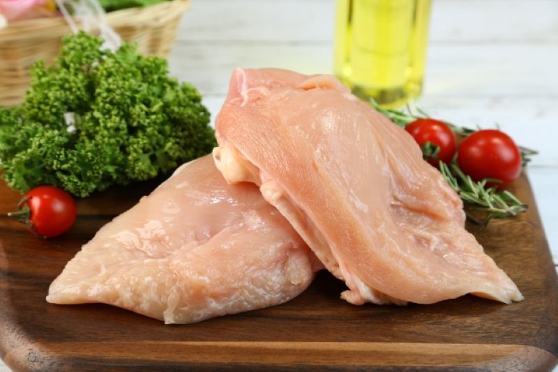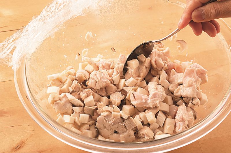 【2】鶏胸肉と酢を耐熱容器に入れてもみ込み、エリンギをのせてふんわりとラップをかけ、電子レンジで4分加熱する