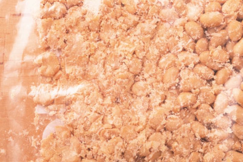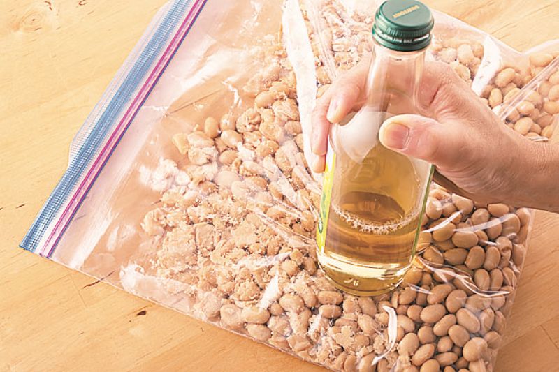 【3】保存袋に蒸し大豆を入れて、粗くつぶしておく。ビンの底など平らなものでつぶすと楽々。つぶれていない大豆が半分残っているくらいでOK