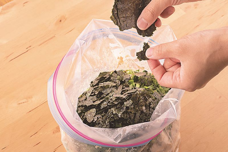 【5】【4】の加熱が終わったら【3】に入れ、ちぎったノリと分量の味噌、ニラを入れて混ぜ合わせ、全体をよくもむ
