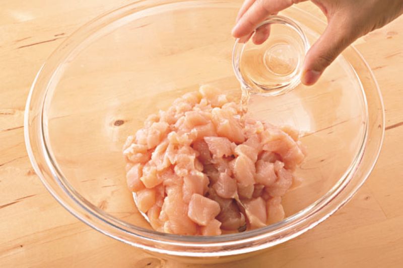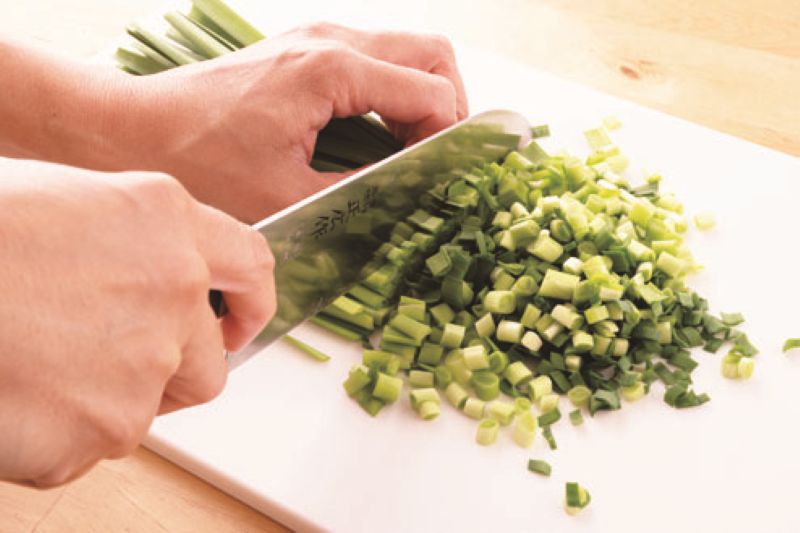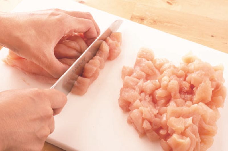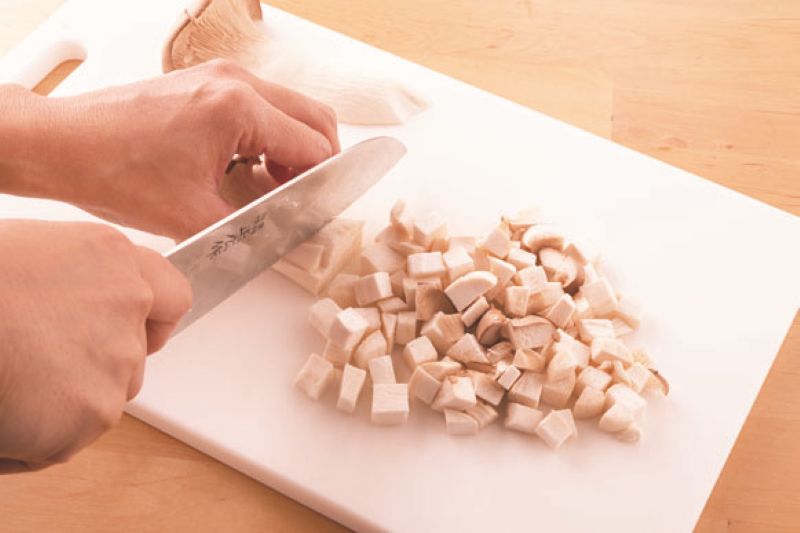 【1】ニラを5mm幅に切る。エリンギは5~7mm幅に切る。鶏胸肉を7~8mm角に切る