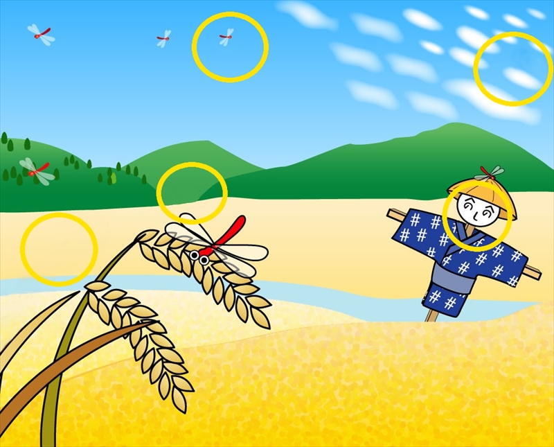 正解を丸で囲みました。赤トンボの数、雲のひとつが消えている、山の麓の形、かかしの「も」が「」し」に、稲の葉が少ない、の5か所でした。新米が出回る季節、お手頃で買えるようになるといいですね。