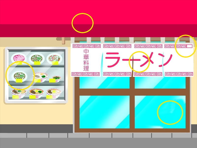 軒の影の幅、暖簾の模様、「ラーメン」の棒が長い」、ショーケースのサンプル、ガラスの反射…が正解でした。軒の影なんかは見逃しやすいかもしれません。