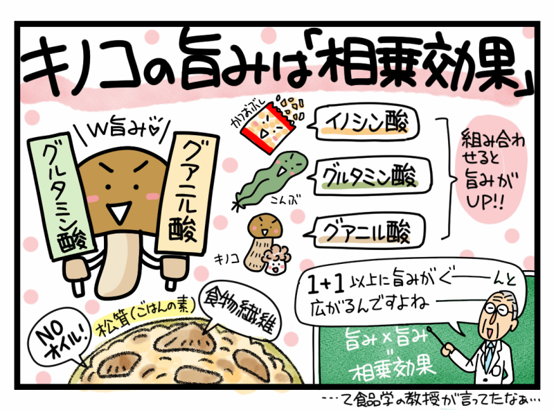 そしてなんと、松茸・椎茸・しめじをはじめ、ほとんどのキノコには「グルタミン酸」と「グアニル酸」という2種類の旨み成分が最初から備わっているんです。生まれもっての「混合だし」。さらにこの組み合わせは「相乗効果」が大きいんだそう。