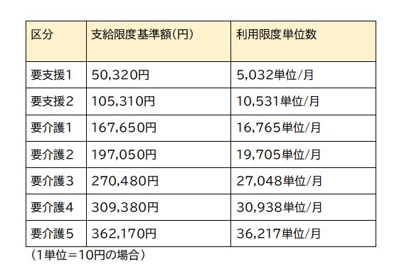 介護保険のサービスは、要介護度ごとに1か月あたりの利用限度額(支給限度基準額)が決められています。