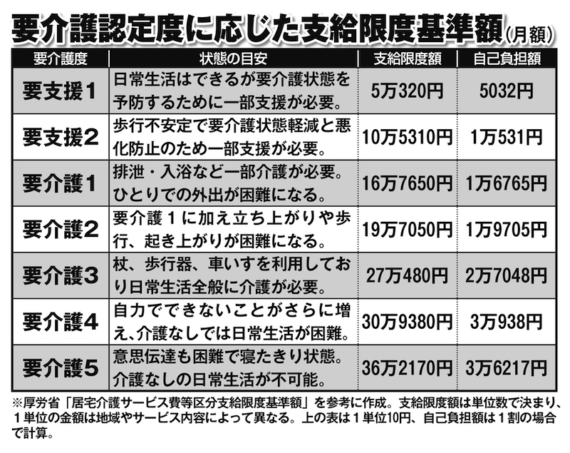 ※厚労省「居宅介護サービス費等区分支給限度基準額」を参考に作成。支給限度額は単位数で決まり、1単位の金額は地域やサービス内容によって異なる。下の表は1単位10円、自己負担額は1割の場合で計算。