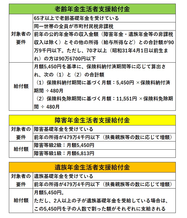 年金生活者支援給付金には、「老齢年金生活者支援給付金」、「障害年金生活者支援給付金」、「遺族年金生活者支援給付金」の3種類があります。それぞれ解説していきましょう。