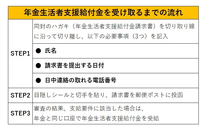 封筒が届いたら、中のはがきに氏名など必要事項を3か所記入し、返送するだけです。その後、日本年金機構で審査が行われ、要件を満たしていれば支給が始まります。