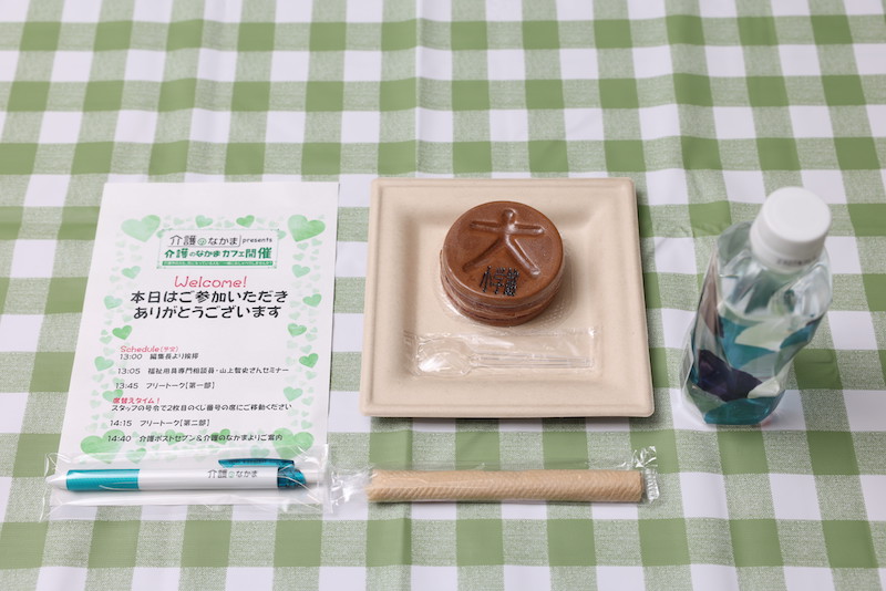 さらに編集部からは、先に紹介した「介護のなかま」ロゴ入りのオリジナルボールペンと、介護のなかまカフェ第1回でもお土産にし、参加者に大好評だった神保町名菓、大丸やき茶房の『大丸やき』を用意。特別に小学館の焼き印入りのものだ。