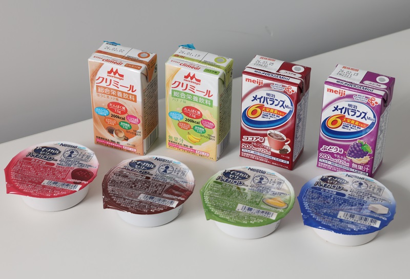 テーブル上には、介護に活用できる栄養補助食品、『メイバランスMini』(明治)、『エンジョイクリミール』(森永乳業クリニコ)、『アイソカル ゼリー ハイカロリー』(ネスレ)を用意、さまざまな味を試してもらった。