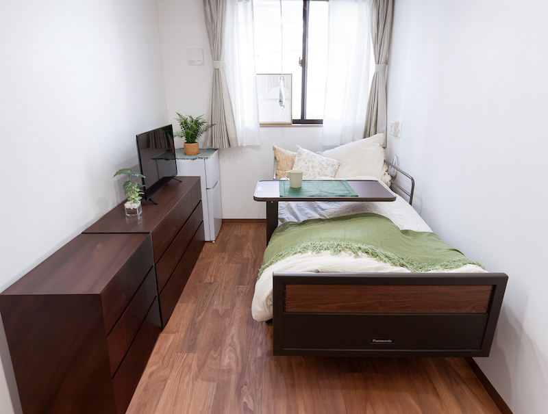 居室は全て個室でプライバシーを確保。室内にはテレビ、冷蔵庫、介護用ベッド、エアコンなどが備え付けられており、新たに買い揃える必要がなく、着替えさえあれば即入居できる。