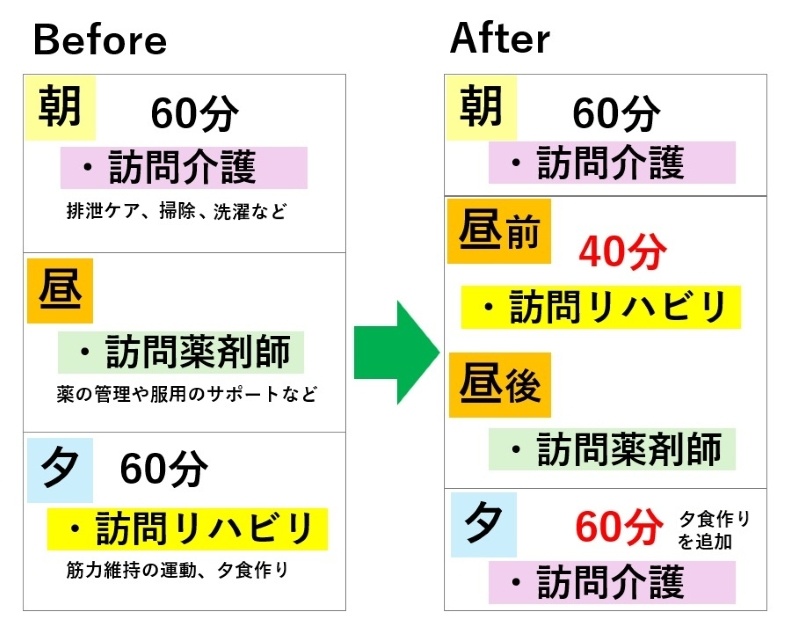 朝:訪問介護 → 昼前:訪問リハビリ → 昼後:訪問薬剤師→ 夕:訪問介護