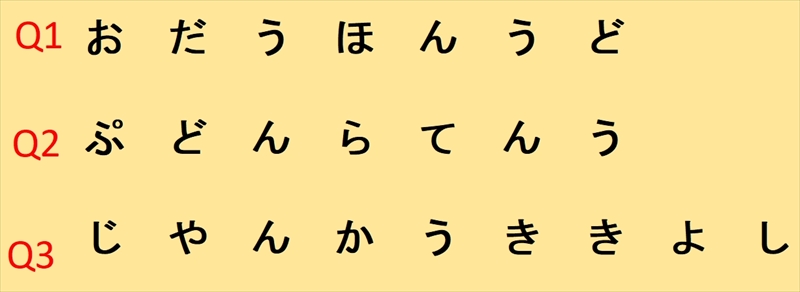 一般的な単語を適当に並べ替えてあります。正しい順に直して、意味のある言葉にしてください。正解では小さい文字で表すものも、大きい文字にしています(例:きっぷ→きつぷ)。