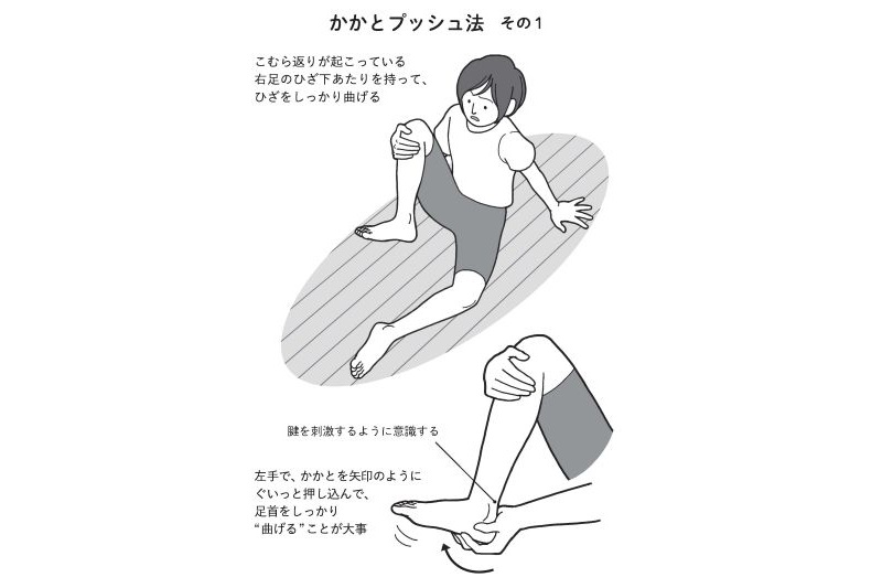 「こむら返りリセット法」を続けることで、こむら返りを防ぐことが期待できるが、それでもこむら返りが起きてしまったときは「かかとプッシュ法」がおすすめだ。こむら返りが起こったとき、急いで足を伸ばそうとする人が多いが、実際は「しっかり足首を曲げる」のが正解。「かかとプッシュ法」であれば、足首を曲げることで腱紡錘を刺激でき、脊髄から筋肉に、筋肉を伸ばす指令を出すことができる。