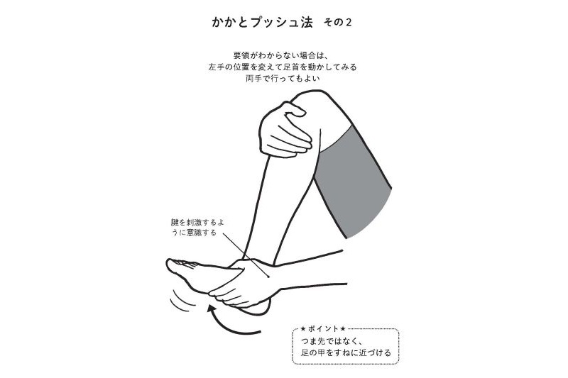 「こちらの場合も、かかとにつながっている『腱』をしっかり意識するのがコツです。『かかとプッシュ法 その1』と同じく、腱にあるセンサー(腱紡錘)に刺激を送ることで、暴走して収縮しいていたふくらはぎの筋肉がスッと落ち着いていきます」