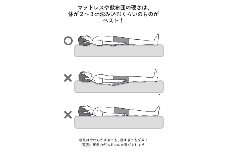 「やわらかすぎるよりはマシですが、硬すぎる寝具も体がうまくフィットせず、やはり寝返りを阻害してしまいます。理想の寝具は、『体が2~3cm沈み込むくらいの適度な硬さ』。寝返りを妨げず、血流をスムーズにしてくれる睡眠環境を整えましょう」