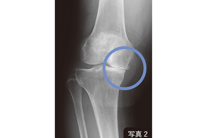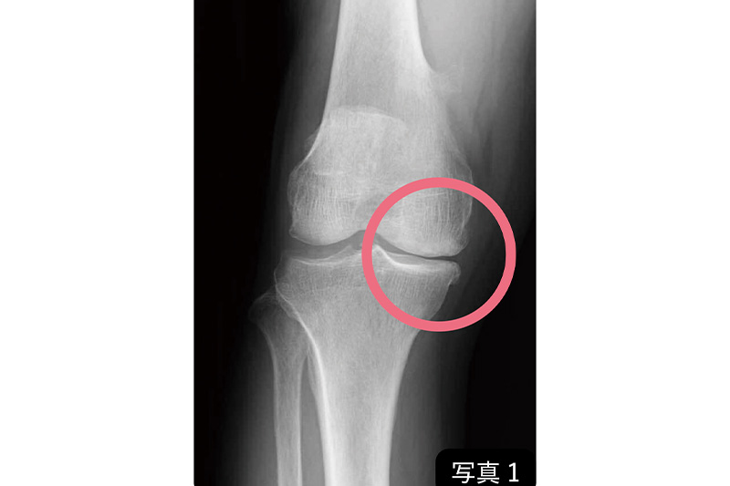 別掲の写真1を見てください。初期の「変形性膝関節症」の人のひざ関節の、立った状態のレントゲン写真です。関節の中を見ると、大腿骨と脛骨の間に隙間が見えます。