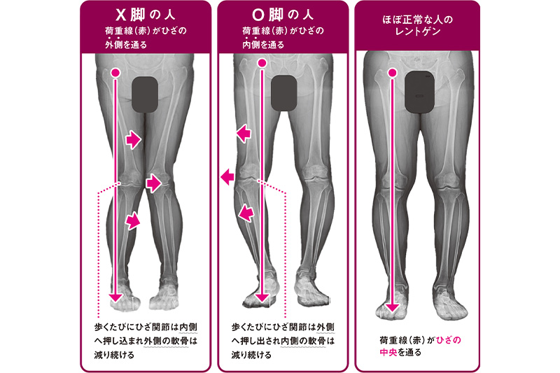 ほぼ正常な人と比べてO脚の人は歩くたびにひざ関節が外側へ押し出されてしまいます。X脚の人は歩くたびにひざ関節が内側へと押し込まれます。それぞれ軟骨のすり減る場所が違います。