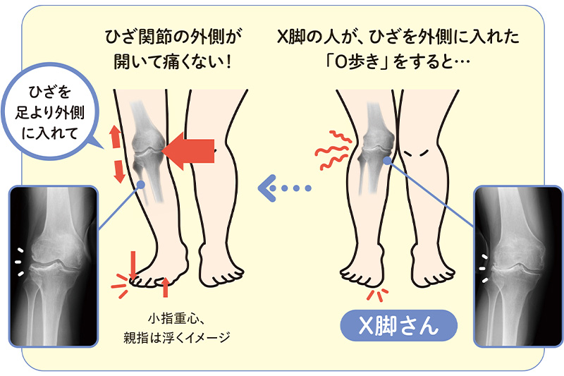 X脚の人なら、О脚の人のように歩く。ひざを足より外側に入れると、ひざ関節の外側が開いて痛くなくなります。小指重心で、親指は浮くイメージです。