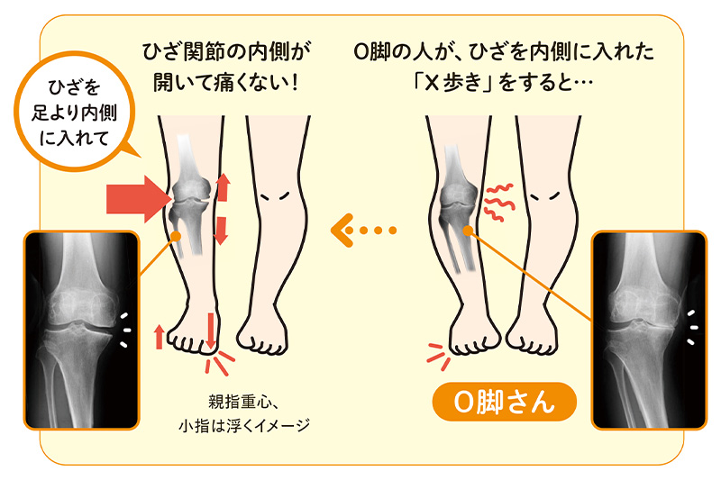 日本人に多いО脚の人ならば、О脚を改善するために、X脚のように歩く。ひざを足より内側に入れると、ひざ関節の内側が開いて痛くなくなります。親指重心で、小指は浮くイメージです。