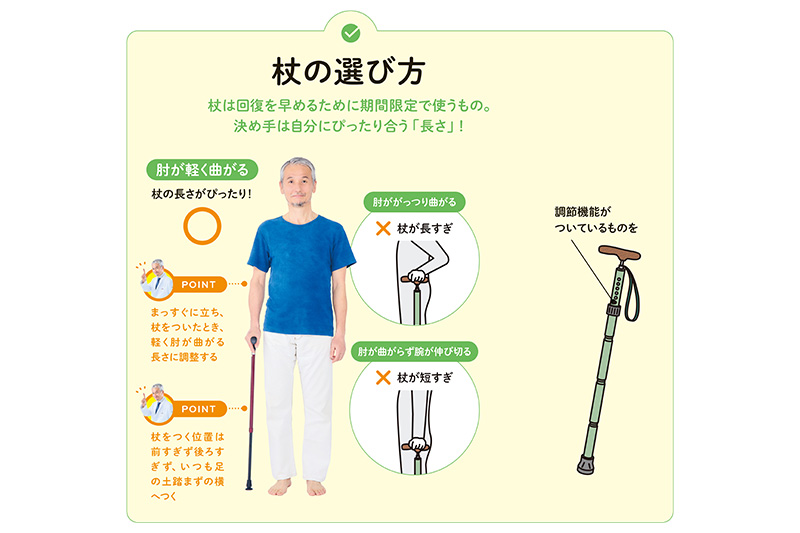 決めては自分にピッタリ合う「長さ」。調節機能がついたものを選びましょう。まっすぐ立って杖をついたとき、軽く肘が曲がる長さに調整します。肘ががっつり曲がったり、逆に腕が伸び切らないように。杖をつく位置は前すぎず後ろすぎず、いつもの土踏まずの横へ着くようにしましょう。
