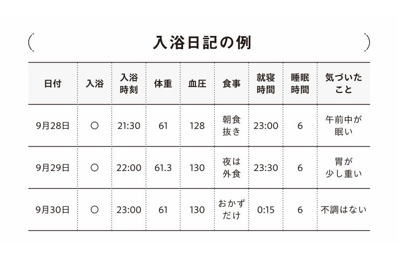 早坂さんは、入浴の健康効果を高め、実感するため、日々の体調の変化を可視化する「入浴日記」をつけることをすすめている。変化を記録することで、改善点が見えてくるうえ、数値が良くなってくるとモチベーションにもなるためだ。