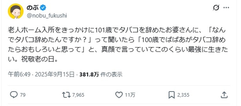 《老人ホーム入所をきっかけに101歳でタバコを辞めたお婆さんに、「なんでタバコ辞めたんですか?」って聞いたら「100歳でばばあがタバコ辞めたらおもしろいと思って」と、真顔で言っていてこのくらい最強に生きたい。祝敬老の日》