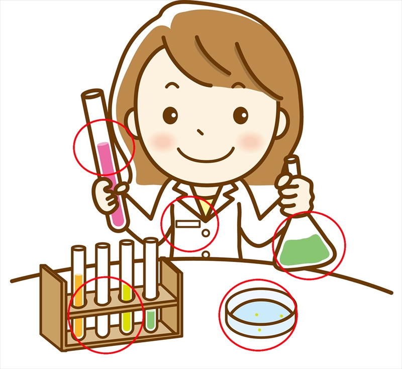 正解はこのとおり。右手の試験管の分量が多い、三角フラスコの液体の色が緑、胸のペンがない、試験管が空、シャーレに謎の物質といった部分が違います。