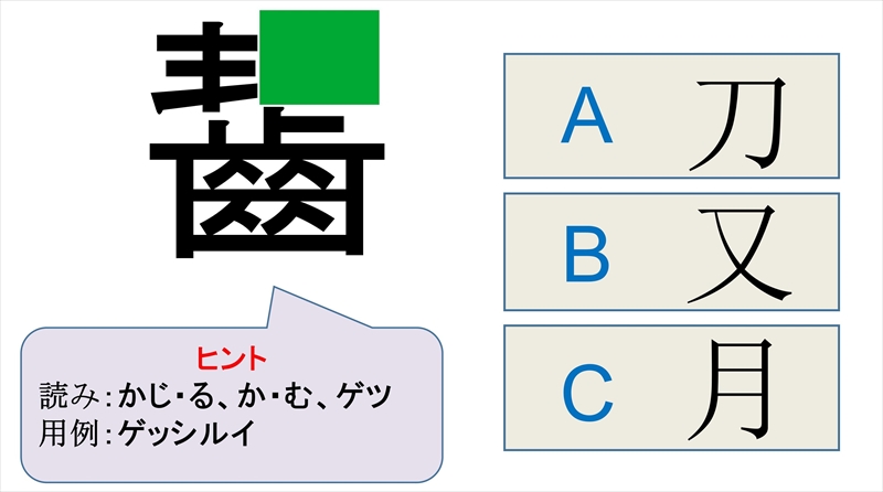 漢字の一部を伏せてあります。読みや用例をヒントにして緑色で隠れた部分はどんなパーツかを、右のA、B、Cから選んでください。