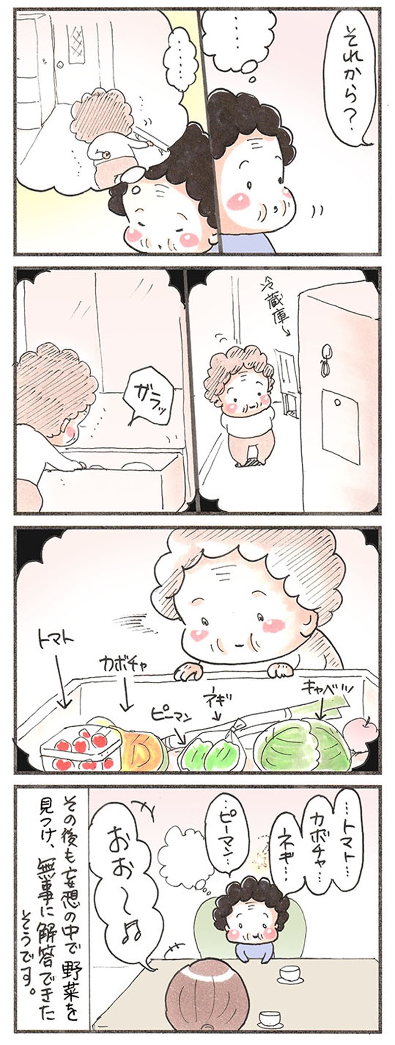 野菜の名前を想い出すのに、「妄想力」をいかんなく発揮したようです。まず妄想したのが「母が野菜炒めを作っているシーン」。それだけでは野菜の数が足りなかったのか、さらに「冷蔵庫の野菜室」へと妄想を飛躍させます。妄想の膨らませ方が上手なおばあちゃんは、最終的に野菜の名前しっかり10個言えたそうです。