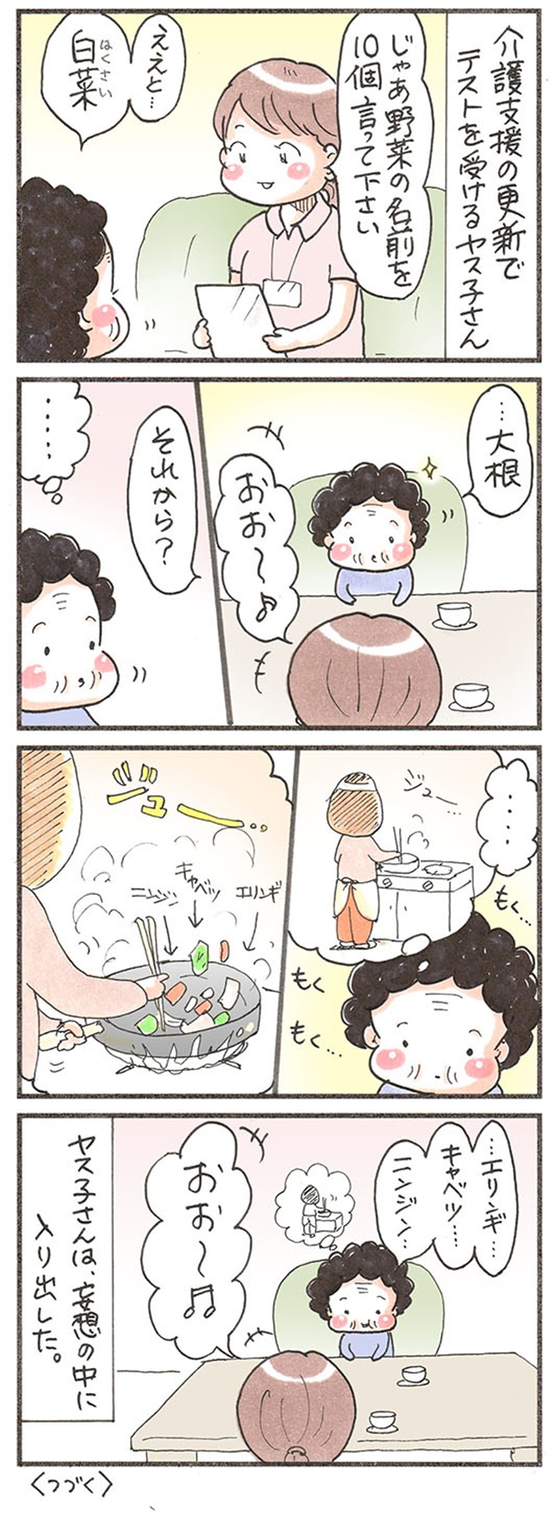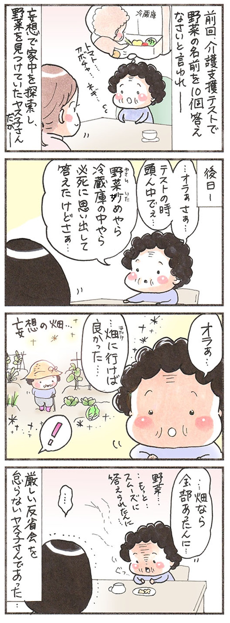 「野菜の名前を10個答える」というテストを受けたときのこと。テストを終えたおばあちゃんが帰宅後、その経緯を嬉しそうに教えてくれました。
