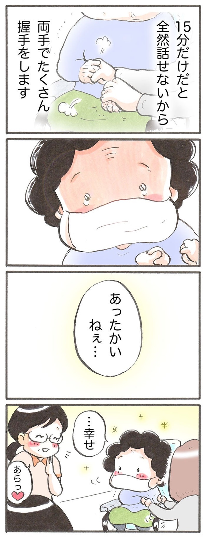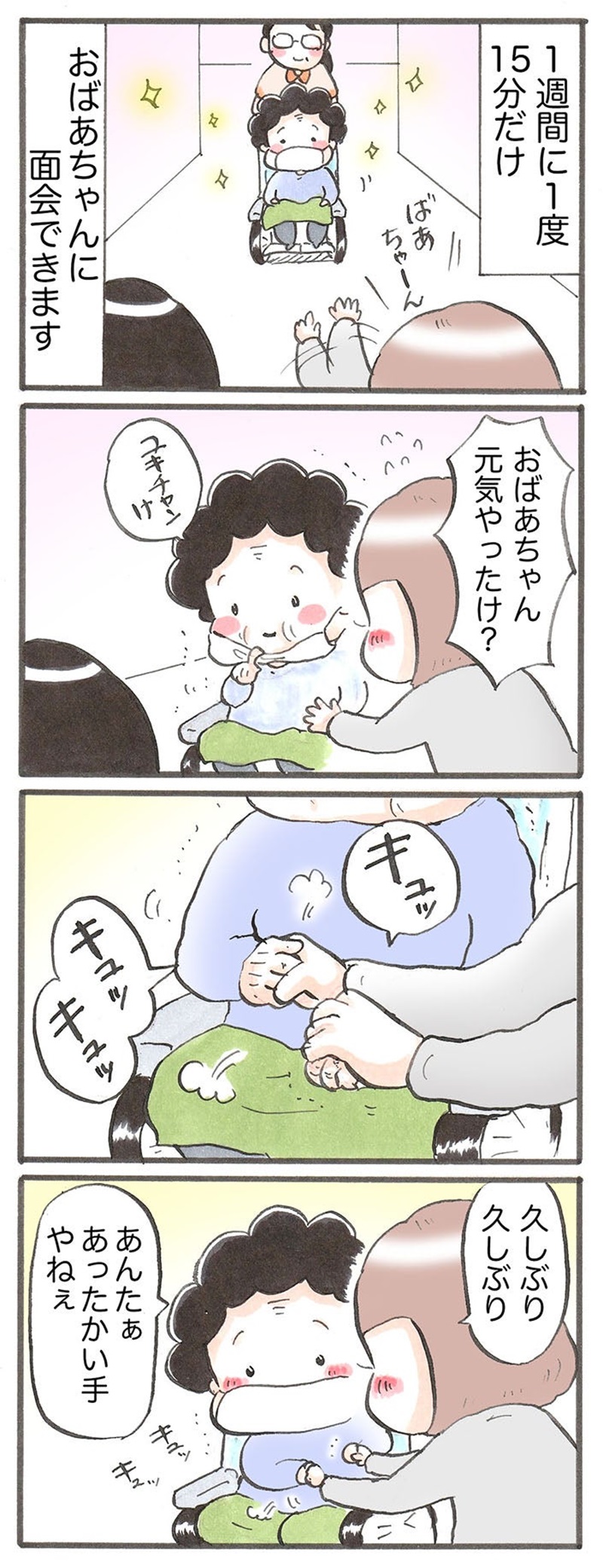 最近のおばあちゃんはとっても元気で、施設で開催されるちょっとしたゲームにも積極的に参加しているようです。面会時間が15分と限られているので、会えたときはいつもぎゅっと手を握り合って幸せを噛みしめながら、おしゃべりをしています。