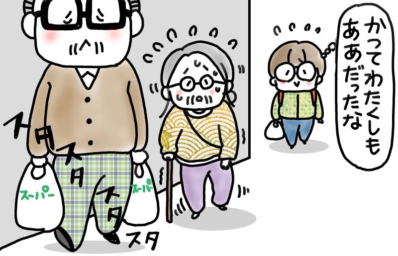 スーパーへの道すがら、老夫婦らしきお二人が歩いているのを拝見したのです。歩く姿からして、女性はだいぶご高齢で杖を持ちながらツッツッツッツッと、つま先を擦るように細かく進んでおりました。ところが男性はゆっくりとはいえマイペースな足取りで女性との距離をどんどん離して、後ろを振り返りもしません。女性はその背中に追いつこうと懸命に歩いているように見えました。わたくしはその老女を追い越すことができず、しばらくゆっくり後ろから見守りました。ふと女性が足元を気にして立ち止まり、男性の背中から目を離したタイミングで、夫とおぼしき男性がスッと角を曲がってしまいました。わたくしは、老女がそれに気づかず道をまっすぐ進んでしまったら「ここを曲がりましたよ」とお伝えしようと思いました。