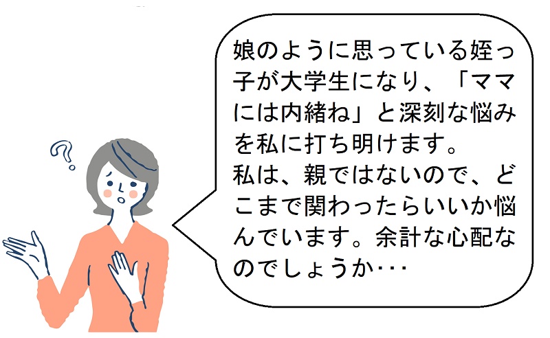 自分はどういう立場で妹や姪たちに接するのがいいのか、わからないこの頃です。妹の子どもとはいえ、私は家族ではないので、余計な心配は無用なのでしょうか。何か自分にできることはないかと、もどかしい思いです。妹とも妹のダンナさんとも、とても仲良く付き合っています」