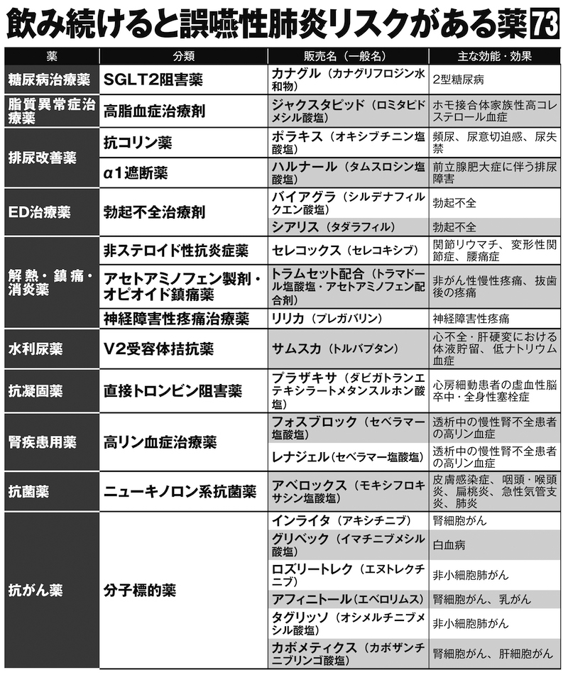 誤嚥性肺炎(ごえんせいはいえん)の原因について、これまで加齢による嚥下機能の低下ばかりに目が向けられてきた。だが、最新の研究報告が示したのは新たな可能性だった。「薬の副作用」が発症リスクとして無視できないというのだ。誤嚥性肺炎のリスクがある薬を調査し、73品目をまとめた。