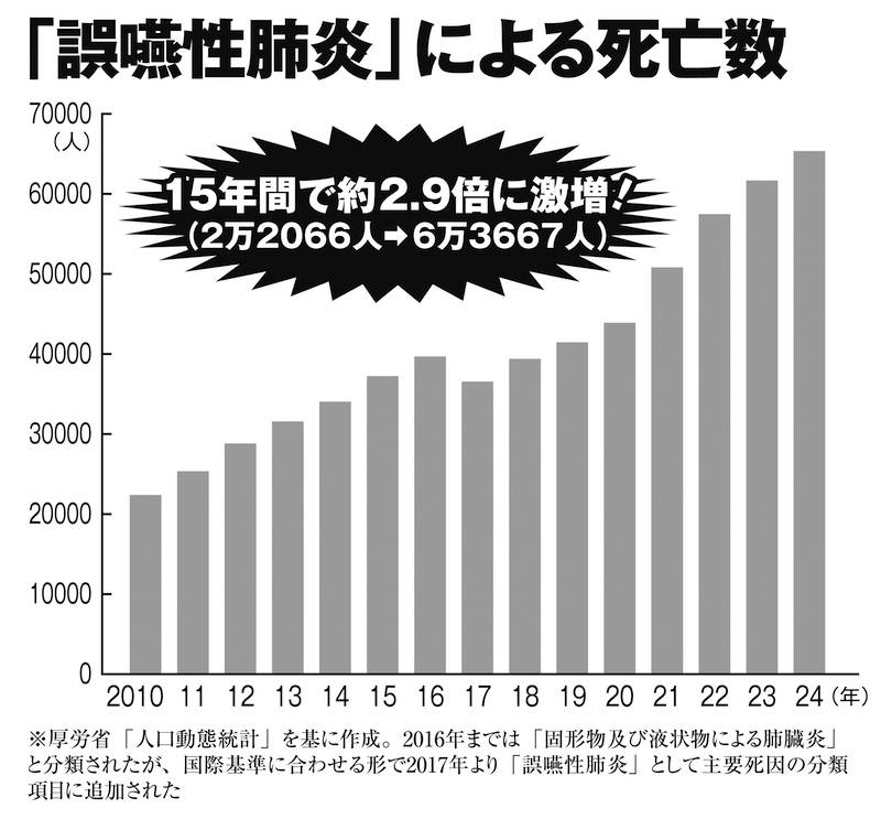 日本人の死因上位のうち、「誤嚥性肺炎」による死者が2010年代以降激増している。