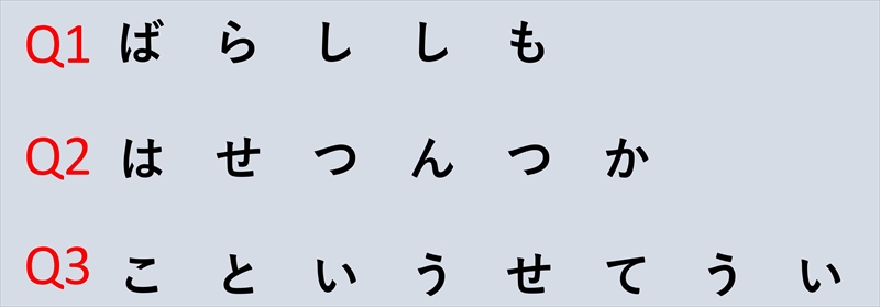 誰もが一度は目にしたことがあると思われる言葉の順番を、ランダムに入れ替えてあります。正しい順に並べ直すと、意味のある言葉になります。正解では小さい文字で表すものも、大きい文字にしています(例:きっぷ→きつぷ)。ヒントは「冬の気象」です。