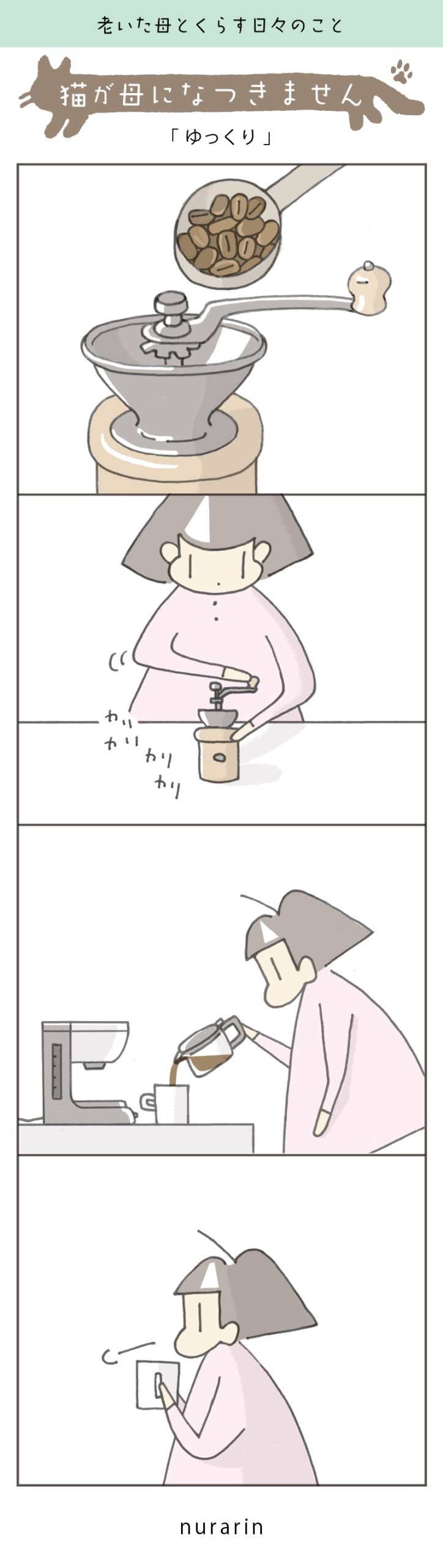 ネットでいろいろ探して、とある自家焙煎のコーヒー専門店の豆を買うことにしました。何度か行ったことのある珈琲屋さんでなので味は知っています。1キロまとめて買うと値段もお手頃、100gあたりで計算すると今まで買っていたもの(値上げ後)より数十円高いだけでした。コーヒーミルは持っていたので、挽かずにあえて豆のままで買いました。 つやつやのコーヒー豆をカラカラとコーヒーミルに入れ、ガリガリと挽く。いい香りがしてそれだけでもう美味しい気分がふくらみます。豆の量を微妙に調節してみたりして、じっくり味わうようにもなりました。いい豆、ひと手間、みたいなことが自分に暗示をかけているのかもしれませんがやっぱり美味しい。コーヒーを淹れる時間がすこしゆっくりになりました。 余談ですが、コーヒー豆のカラカラという音、子猫たちが食べるカリカリの音と似ているので最初はその音に駆け寄ってきたのですが、すぐにその違いを聞き分けるようになりコーヒー豆のカラカラを聞いてもなんの反応もしなくなりました。子猫たちの耳の良さにも感心しきりです。