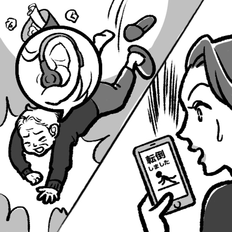 アメリカのブランド・スターキーで開発している最新機能。スマホのアプリと補聴器を連携させ、センサーで転倒を検知すると、アプリに通知が届く。高齢者がいる家族にとって安心の機能で、今後はこのような健康状態を管理する機能も充実しそう。