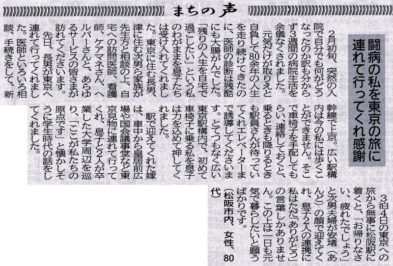 あきちゃんに会った2日後、無事に三重に帰ってきた。主治医が用意してくれた「紹介状」も使わずに済んだ。駅に迎えに来てくれた弟夫婦は、母が東京に行っているあいだ、さぞ気を揉んでいたに違いない。「おかえり」と言った二人も、車椅子から「ただいま」と返した母も、心からホッとした表情を浮かべている。弟夫婦は、私にも「連れて行ってくれてありがとうな」と言ってくれた。
