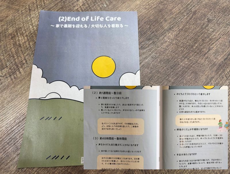 在宅で看取ると決めたときに、訪問介護の看護師さんが「ご参考までに」と置いていってくれたパンフレット。「(3)約48時間~数時間前」の次は「(4)旅立ちのとき」のページがあり、さらに死後の手続きについても詳しく載っている