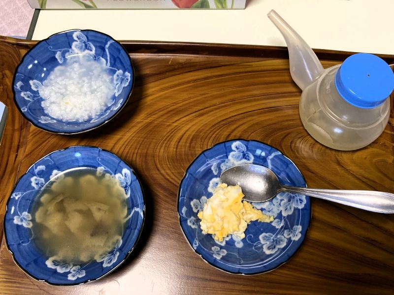 「15日前」の朝食。お粥もおかずも、ひと口かふた口が精いっぱいだった。お見舞いにいただいたメロンやプリン、アイスは、少しずつ一日に何度も食べていた。話せた頃は「こんなおいしいもんばっかり食べとってええんやろか」と、冗談交じりに言っていた