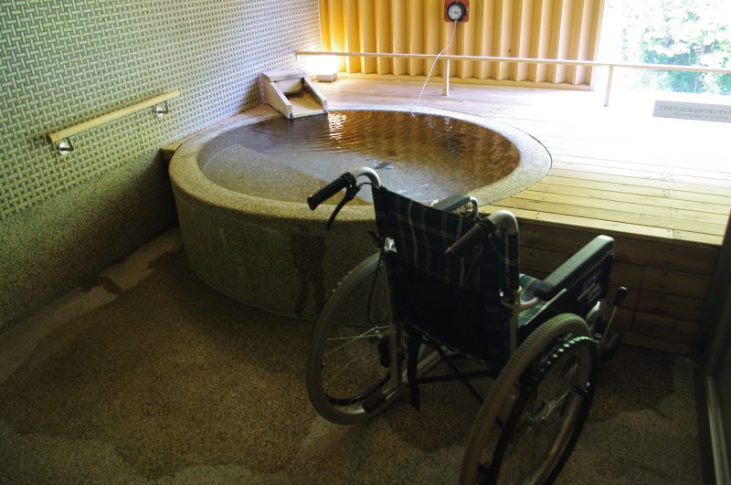 車いす生活の母と温泉に行きたかったのですが、バリアーフリーと宣伝していながら、入口に車いす用のスロープのない所があり、車いすか、専用のいすを使って入れる温泉はないみたいですね。あるホテルは食事の時、向かい合わせにしか座れないとか。片半身不自由な母は、横から食事中に補助が必要なのに。バリアーフリーといっても完全にそうでないと使えない人が多いということを知ってほしいと思います。日本はまだまだバリアーフリーについては遅れていますね。残念です。